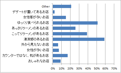 「どんなラーメン屋さんに行きたいですか?」との質問に対し、清潔感があるお店が約60%、ゆっくり食べられるお店が約50%の回答を得ており、清潔感がありゆっくり食べられるお店を女性が支持している事がわかります。